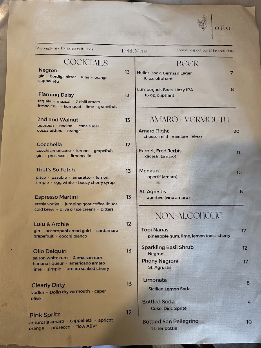 Finish with desserts like panna cotta accented by vanilla bean and a touch of sea salt or a seasonal chocolate cake paired with olive oil ice cream—delicate conclusions that feel nuanced without being heavy. Whether dining inside or on the cozy patio, the menu at Olio complements a thoughtful, unhurried experience, inviting guests to savor moments as much as the flavors.