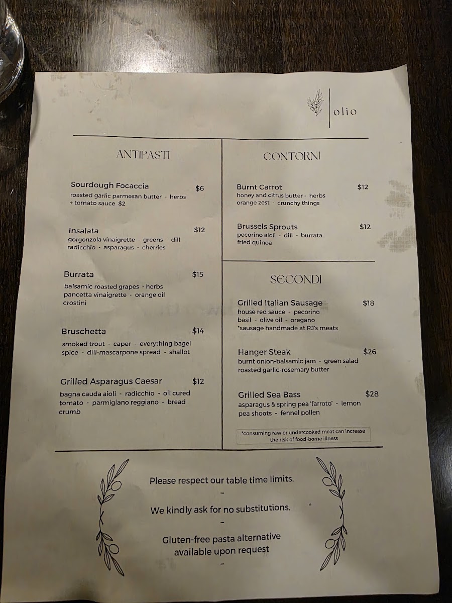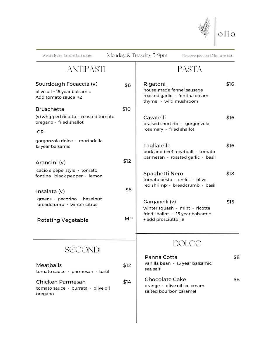 The menu at Olio reflects a thoughtful Italian approach that balances casual charm with refined flavors. You’ll find a variety of small plates and hearty pastas designed to be savored in a relaxed, intimate setting. The offerings highlight seasonal ingredients and traditional preparations, creating an experience that feels both familiar and thoughtfully crafted.